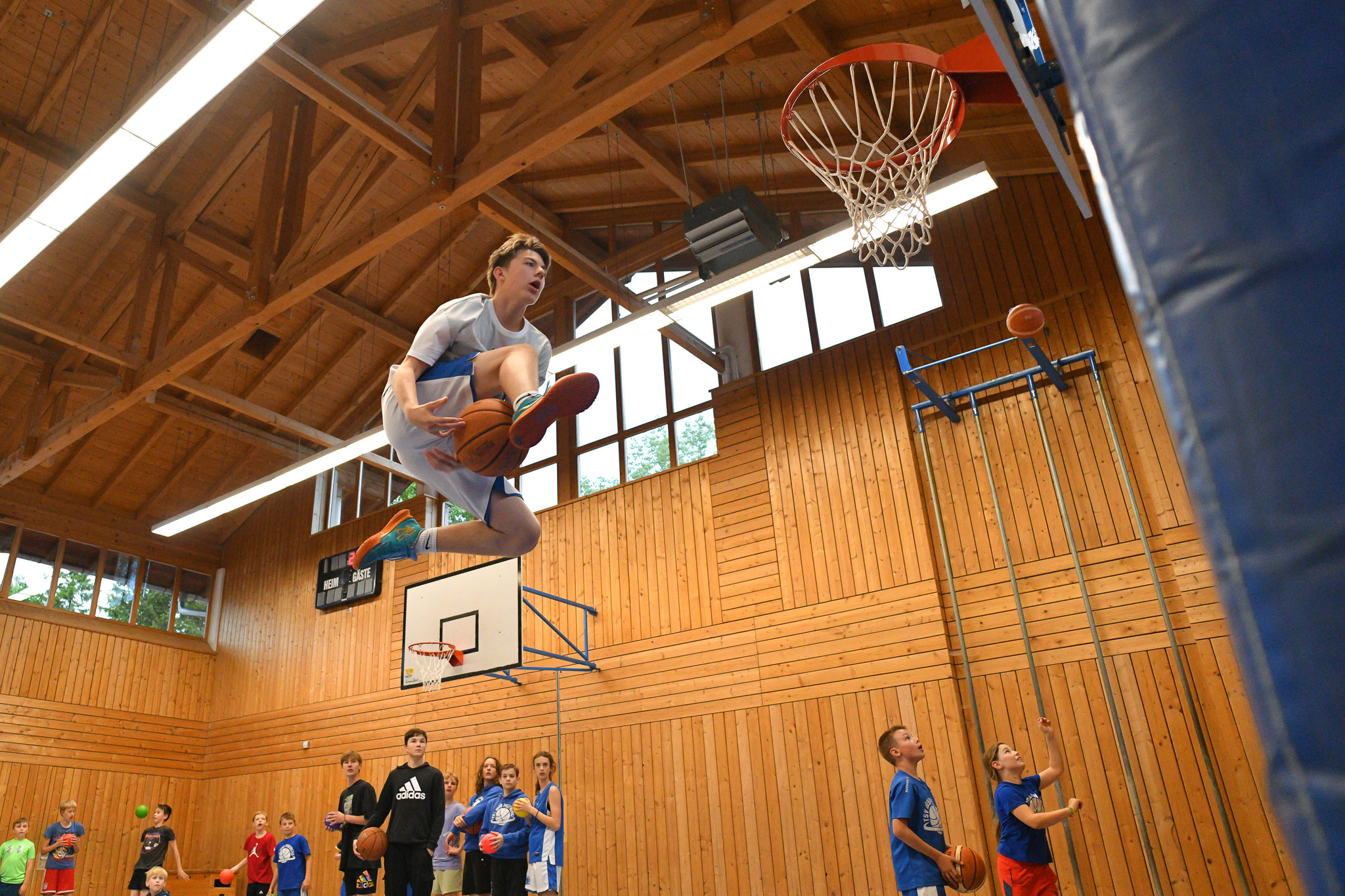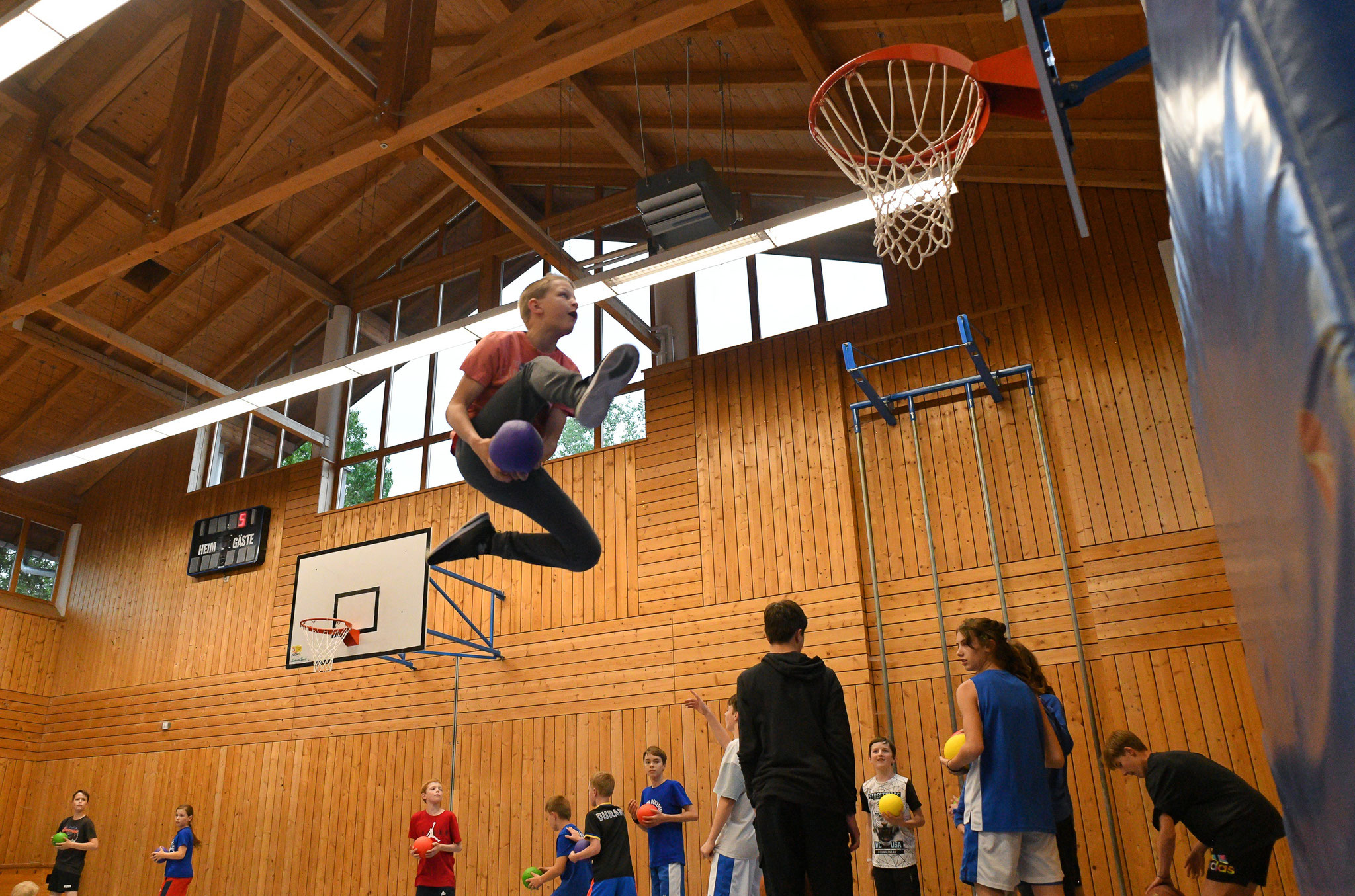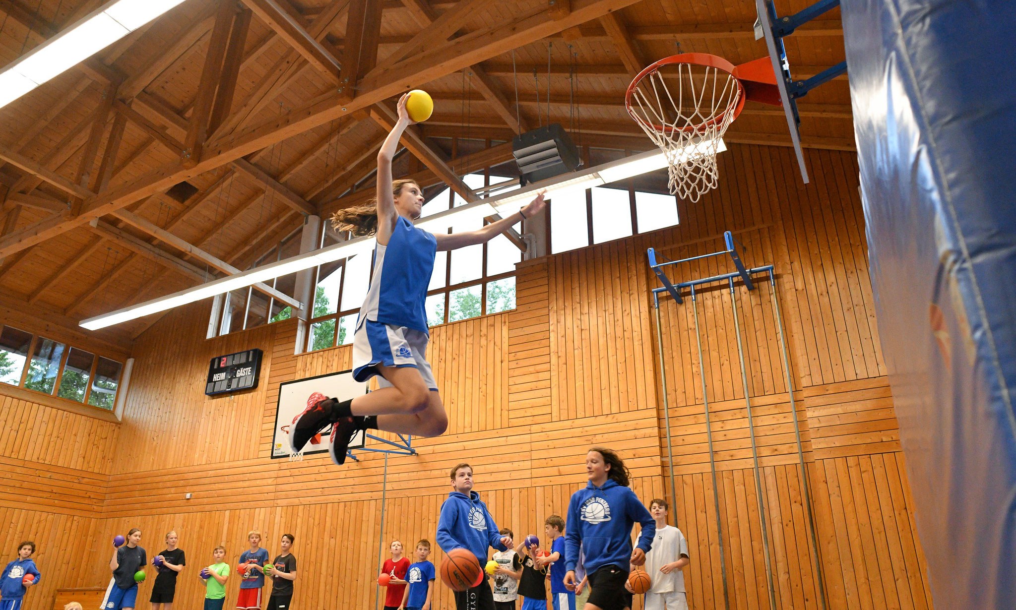 Nun sind am Samstag über 70 Kinder und Jugendliche zusammengekommen, um gemeinsam ein Turnier zu spielen und im Shootout gegeneinander anzutreten. Anschließend gab es für 94 Mitglieder Burger. So wurde in munterer Runde geratscht und gequasselt. Nach dem Essen zog es die Kinder und Jugendlichen wieder in die Halle. Der orange Ball ruhte nicht. Die SpielerInnen maßen sich bei Dunkingchallenge, verbesserten ihre Wurfskills und spielten kleine Wettbewerbe aus.