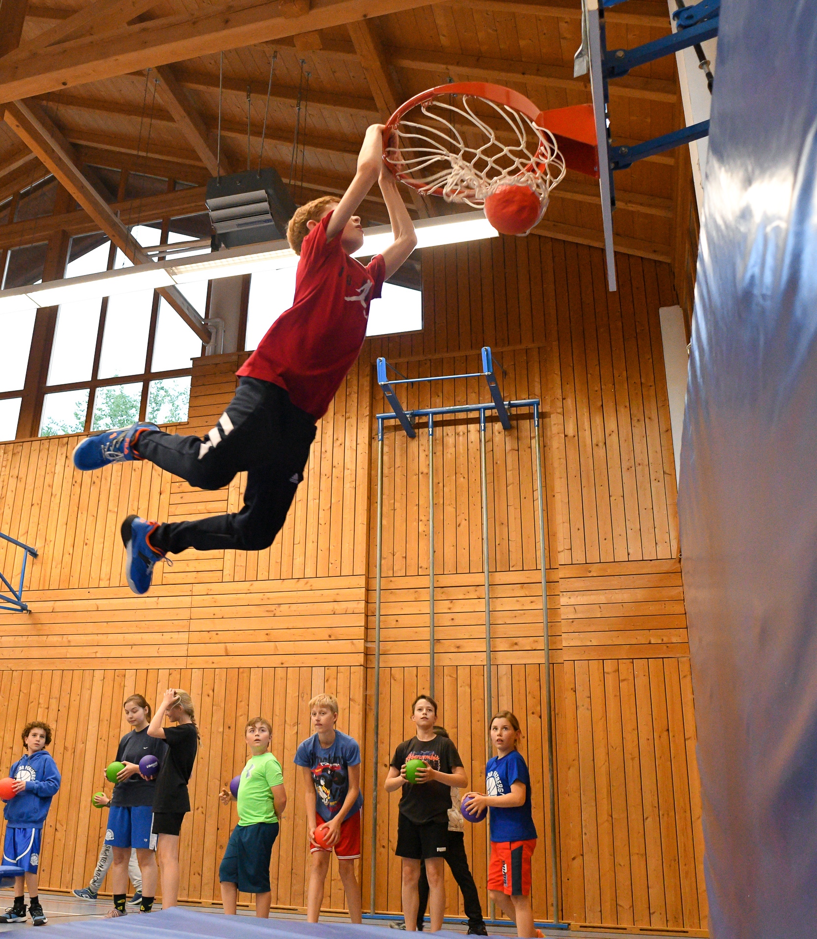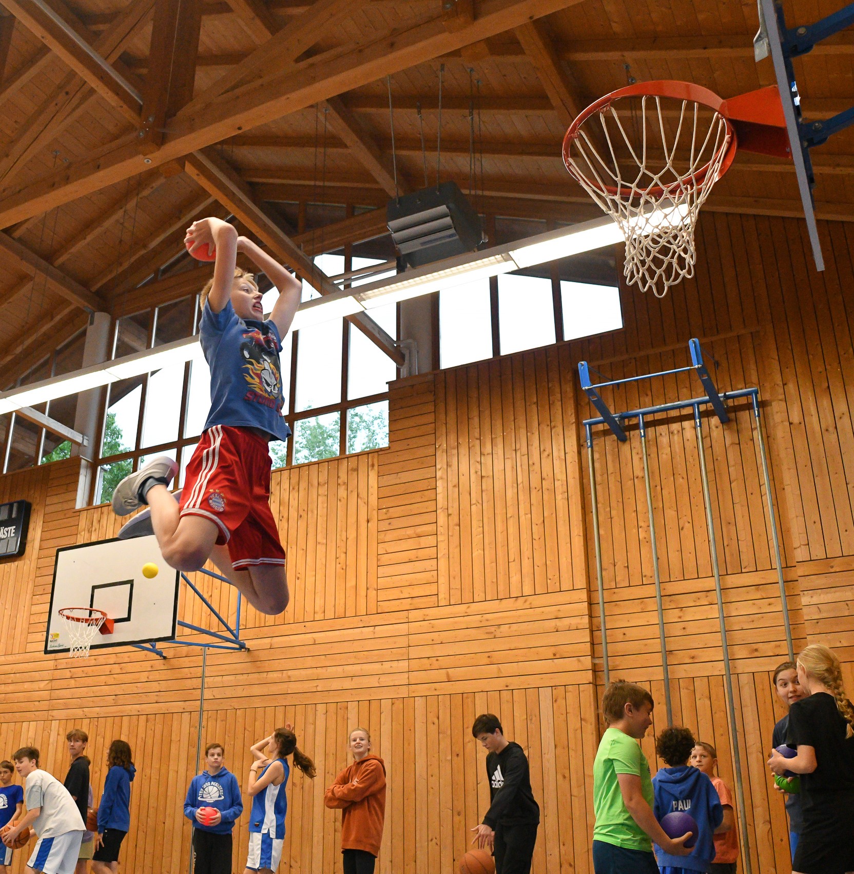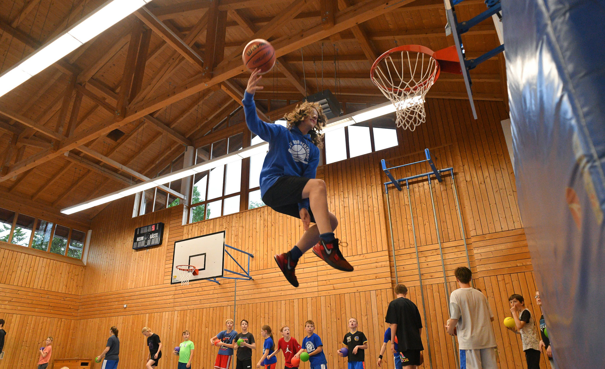 Nun sind am Samstag über 70 Kinder und Jugendliche zusammengekommen, um gemeinsam ein Turnier zu spielen und im Shootout gegeneinander anzutreten. Anschließend gab es für 94 Mitglieder Burger. So wurde in munterer Runde geratscht und gequasselt. Nach dem Essen zog es die Kinder und Jugendlichen wieder in die Halle. Der orange Ball ruhte nicht. Die SpielerInnen maßen sich bei Dunkingchallenge, verbesserten ihre Wurfskills und spielten kleine Wettbewerbe aus.